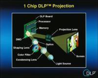 這張圖是簡單的DLP成像原理 有別於LCD, DLP光源提供光線 經由聚光鏡將光線導到色輪 經過色輪的光線就開始有色彩的變化 光線經由DMD的反射透過投影鏡頭投射出去