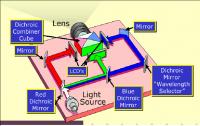 這張圖是概略說明LCD投影機的成像原理現在市面上的LCD投影機幾乎都是所謂3片式LCD投影機顧名思義就是用三片LCD panel來成像三片LCD分別負責RGB的影像成像光源的部份由燈泡提供白光經由分光鏡利用光線折射原理分出紅綠藍三色光再分別送到LCD panel產生彩色影像